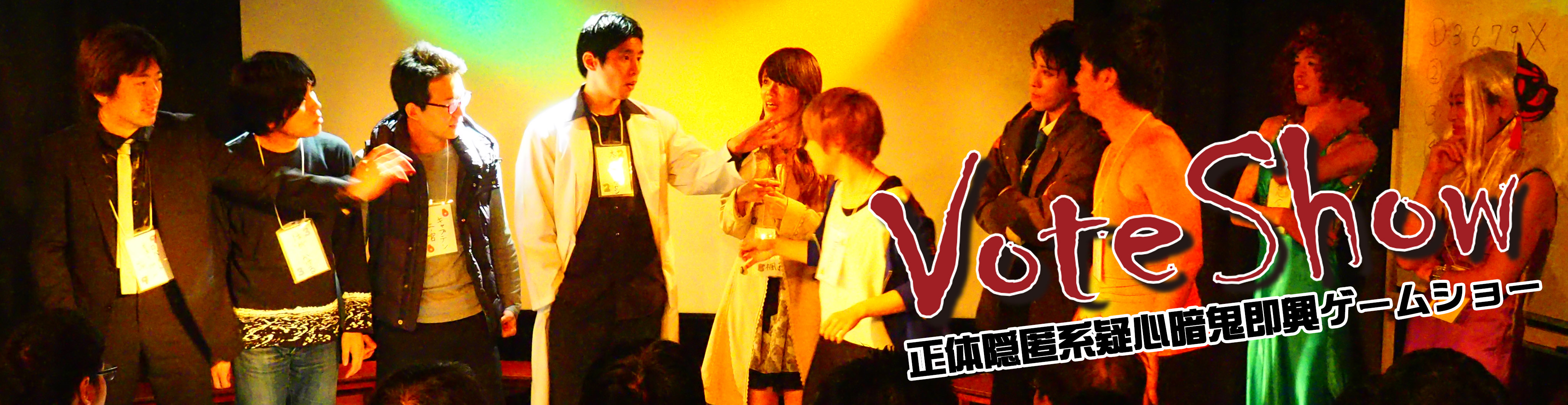 『Vote Show』は定められたルールを前提にし、その上で役者達がキャラクターも世界設定も人間関係も舞台上で即興で作り上げ、そのキャラクター達が紡ぐ人間関係やストーリーを舞台劇として魅せる、正体隠匿系疑心暗鬼即興ゲームショーです。